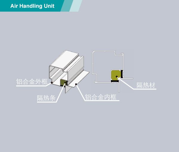 amg·新葡萄88833新一代MAH组合式空气处理机,艾洛斯(Aiolos)系列,采用防冷桥铝合金框架结构设计,面板与框架为压扣连接方式。